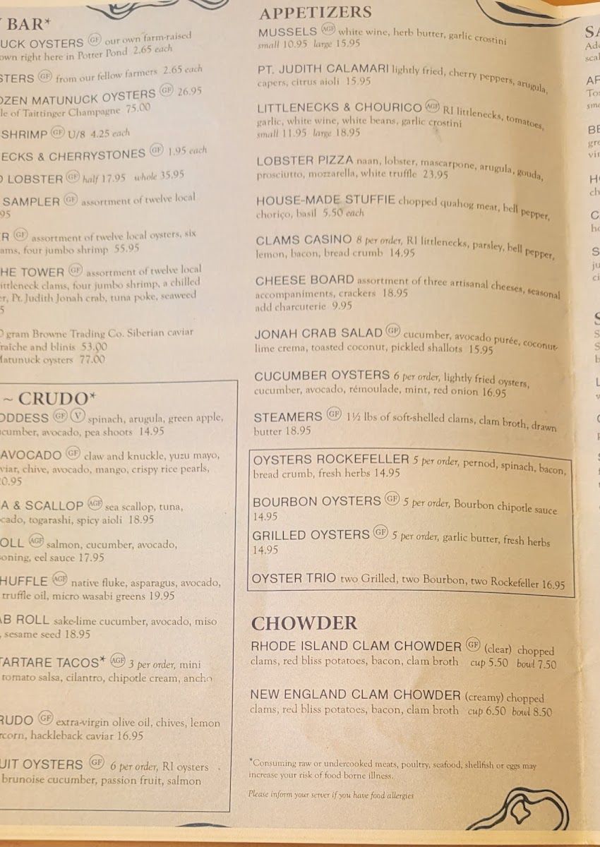 The menu is a testament to the coastal New England seafood experience. Guests rave about the raw oysters and the savory stuffies, both regarded as some of the best around. The seared scallops and crispy calamari embody freshness and simplicity, allowing the natural flavors of the sea to take center stage. Not to mention, the signature Bloody Mary with an oyster shooter offers an unforgettable twist.